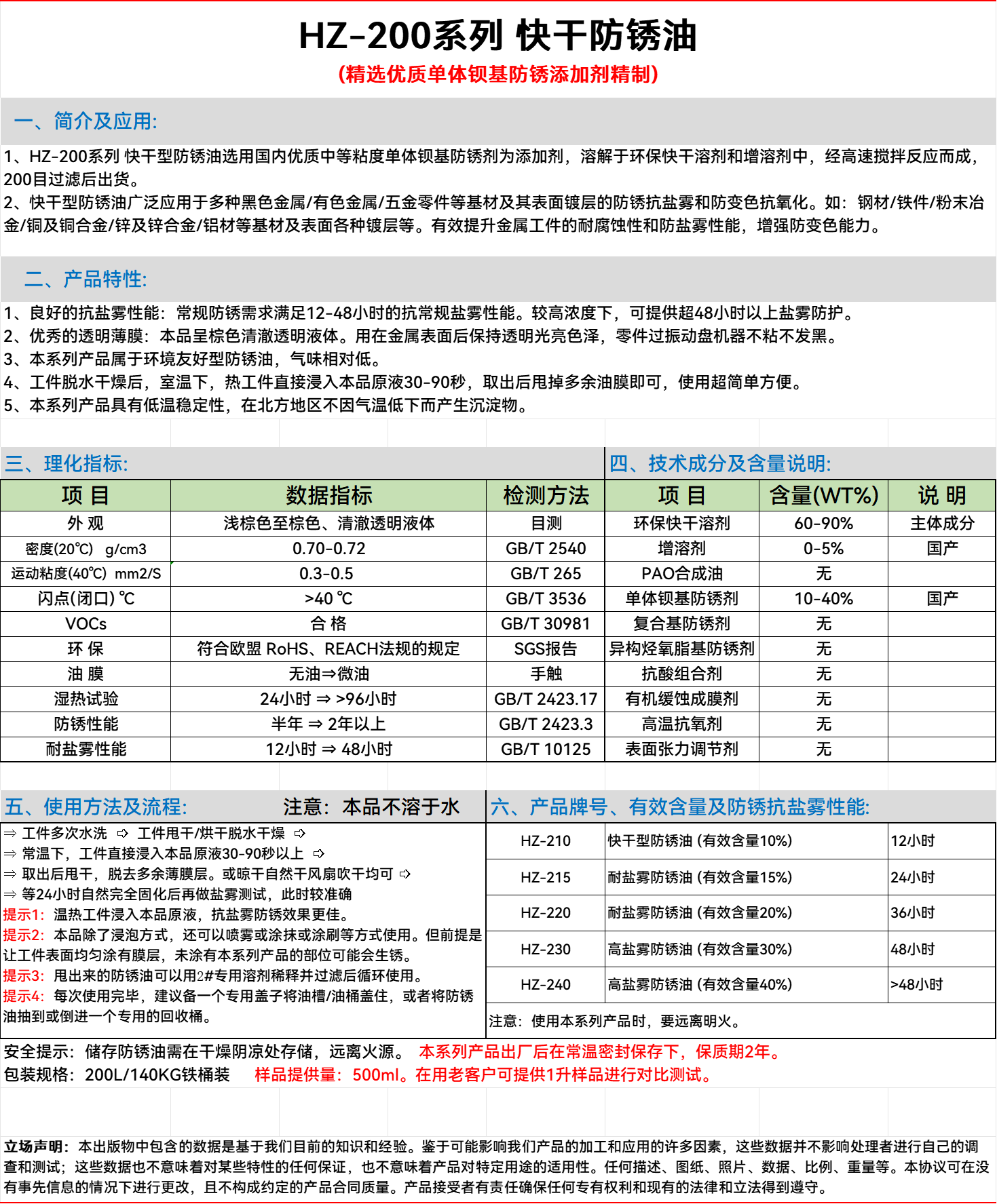 HZ-200系列 快干型防锈油选用国内优质中等粘度单体钡基防锈剂为添加剂,溶解于环保快干溶剂和增溶剂中,经高速搅拌反应而成,200目过滤后出货。快干型防锈油广泛应用于多种黑色金属/有色金属/五金零件等基材及其表面镀层的防锈抗盐雾和防变色抗氧化。如:钢材/铁件/粉末冶金/铜及铜合金/锌及锌合金/铝材等基材及表面各种镀层等。有效提升金属工件的耐腐蚀性和防盐雾性能,增强防变色能力。