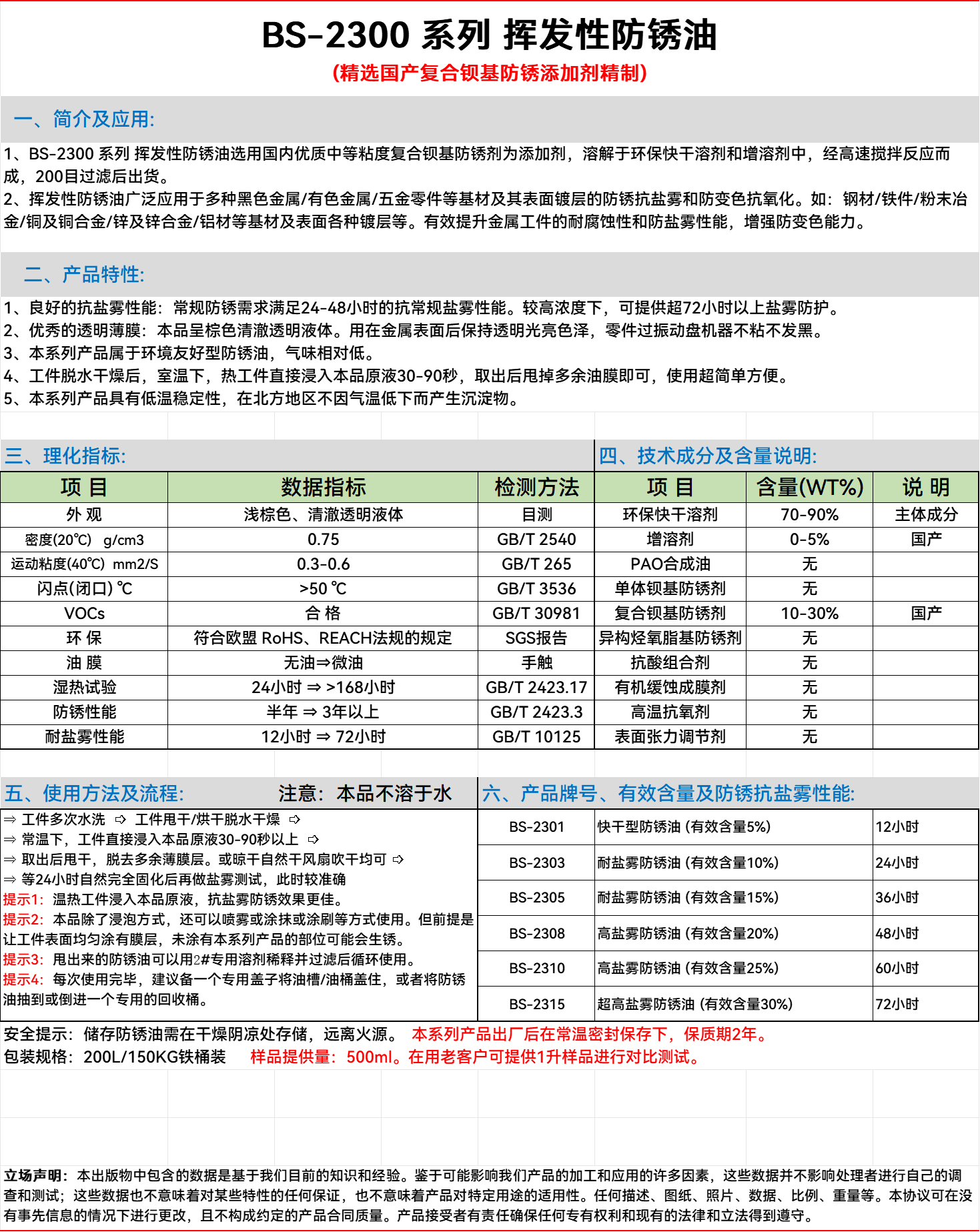 应用于黑色金属、有色金属及其表面镀层,在潮湿环境中表现出优异的腐蚀抑制性能和抗盐雾防锈性能,无油牌号可以提供超24小时以上NSS盐雾防护且金属表面透明无油保持原有色泽及光亮度。微油牌号可以提供超72小时以上NSS盐雾防护并且金属表面保持原有色泽及光亮度。